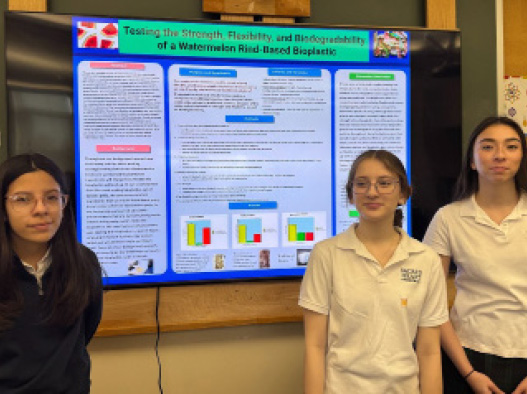 As 8th graders, Stephanie Galvez ‘29, Bonnie Ukperaj ‘29 and Mia Cartagena ‘29 created the project “Testing the Strength, Flexibility, and Biodegradability of a Watermelon Rind-Based Bioplastic” for the Connecticut Science and Engineering Fair (CSEF). Their innovative work earned them a finalist medal and the opportunity to advance to the next round of judging.